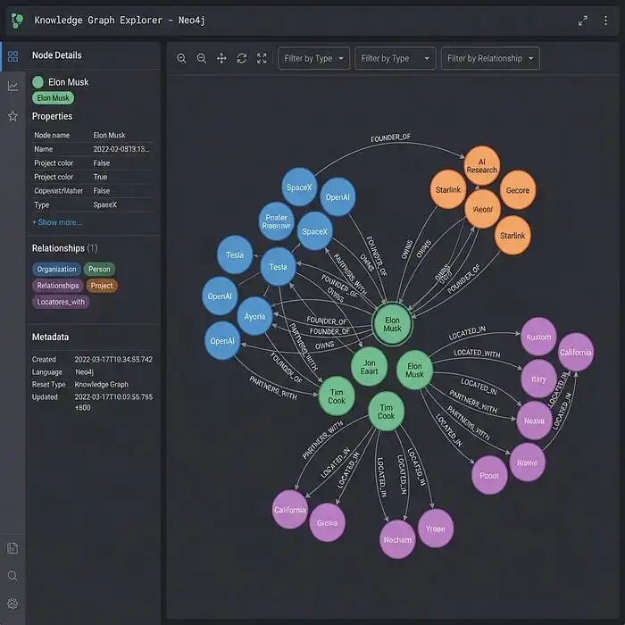 图模式 使用属性图而非 RDF 三元组。实体是带有类型标签的节点(Person、Company、Technology 等),关系是带有属性的类型化边(FOUNDED、WORKS_AT、ACQUIRED 等),节点和关系都具有捕获语义含义的向量嵌入。元数据包括时间戳、来源、置信度分数和溯源信息。这种灵活的模式允许在不进行模式迁移的情况下添加任意属性,同时通过策略性索引保持查询性能。