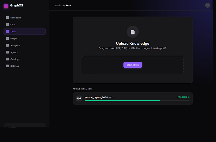 数据摄取从通过 DocumentIngestion 组件上传文档开始。选择一种提取模式(动态、混合或严格),系统将通过 8 阶段摄取流水线处理文档。实体和关系被提取、验证、解析并加载到 Neo4j。向量索引会自动使用所有新实体的嵌入进行更新。