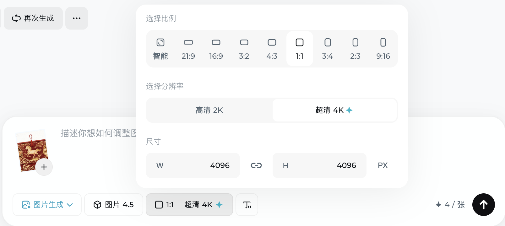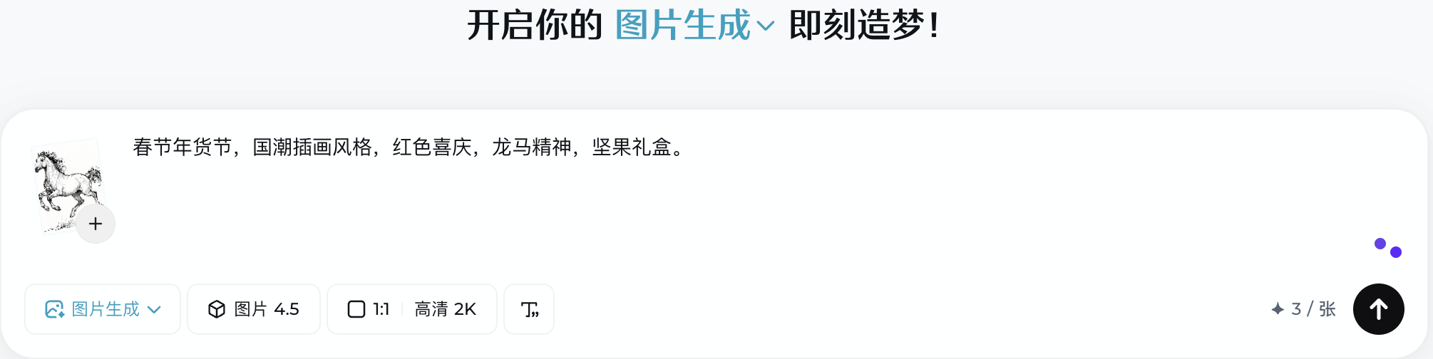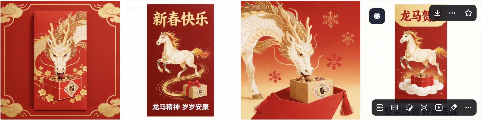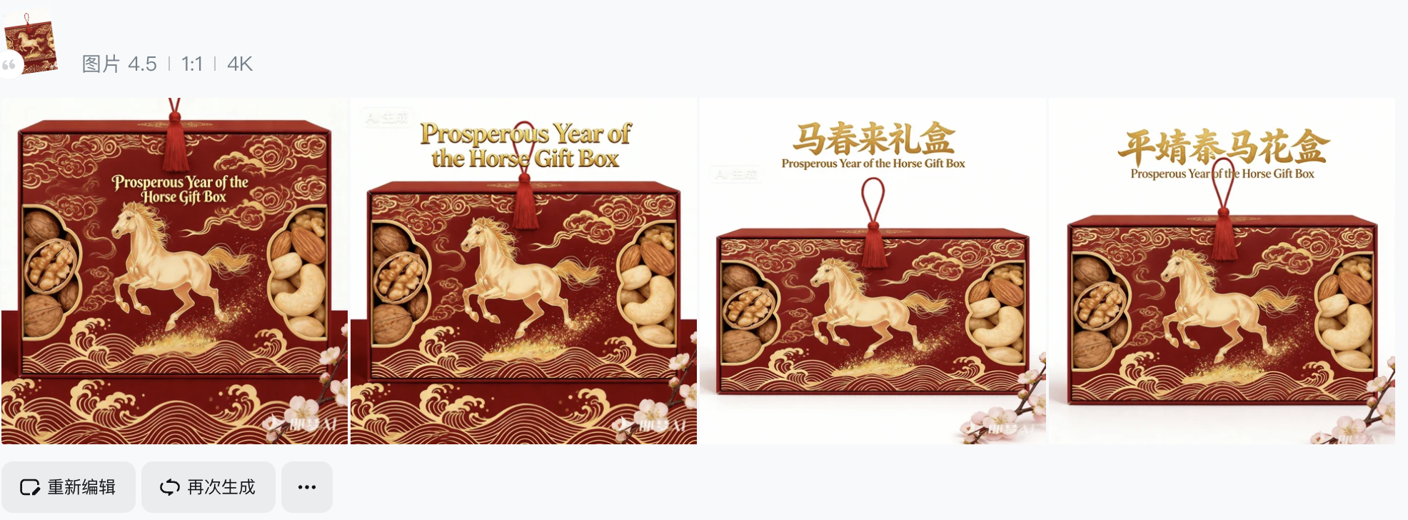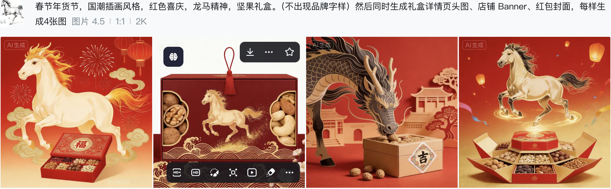 年货节倒计时 7 天,老板突然说:“Simile,今年的坚果礼盒主图太普通了,没得‘年味’!我要那种国潮插画风,还要有 4K 级质感,最好能出一套红红火火的系列海报。哦对了,明早就要。”