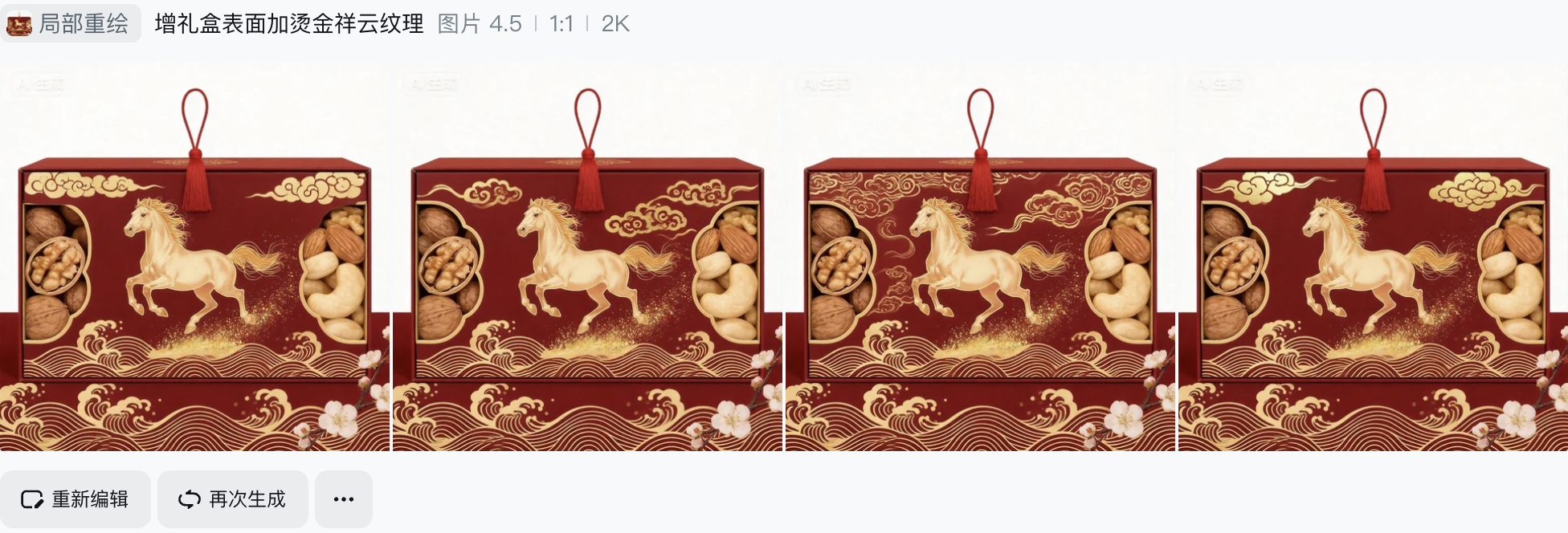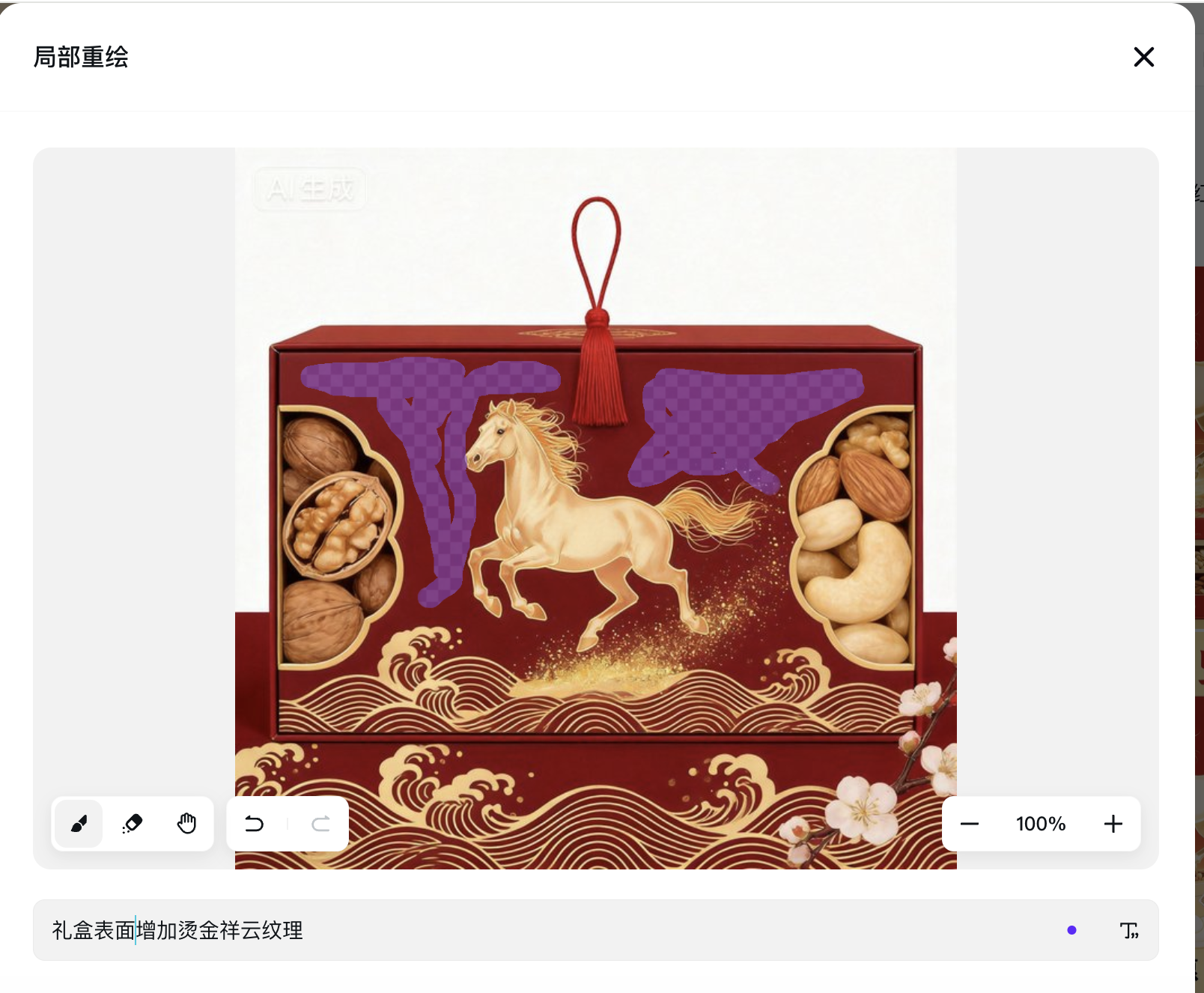 - 我使用 “局部重绘” 功能,框选礼盒表面,输入“增加烫金祥云纹理”。