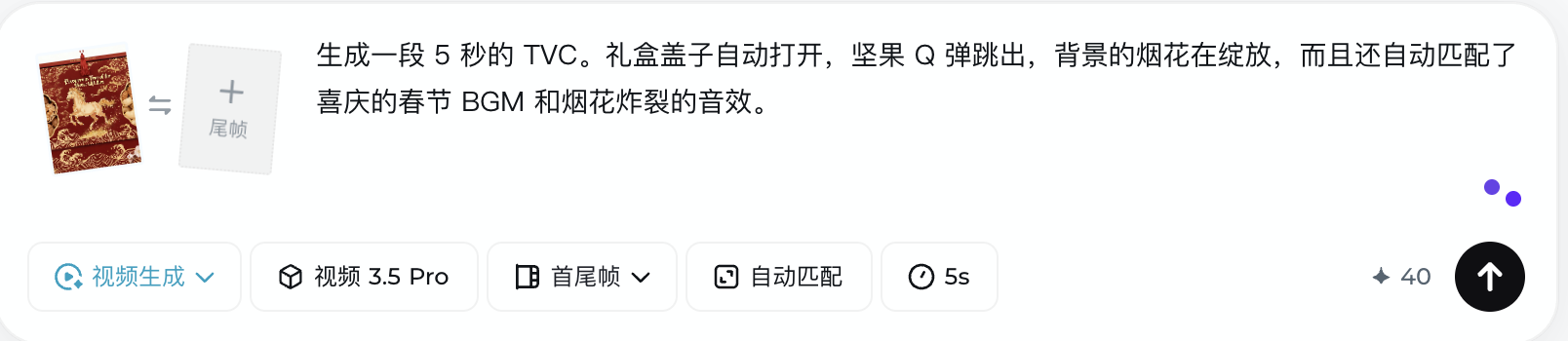 - 结果: 瞬间生成一段 5 秒的 TVC。礼盒盖子自动打开,坚果 Q 弹跳出,背景的烟花在绽放,而且还自动匹配了喜庆的春节 BGM 和烟花炸裂的音效。