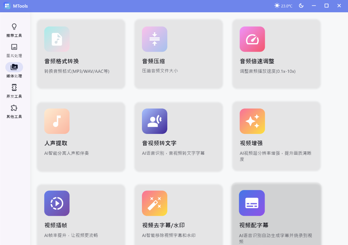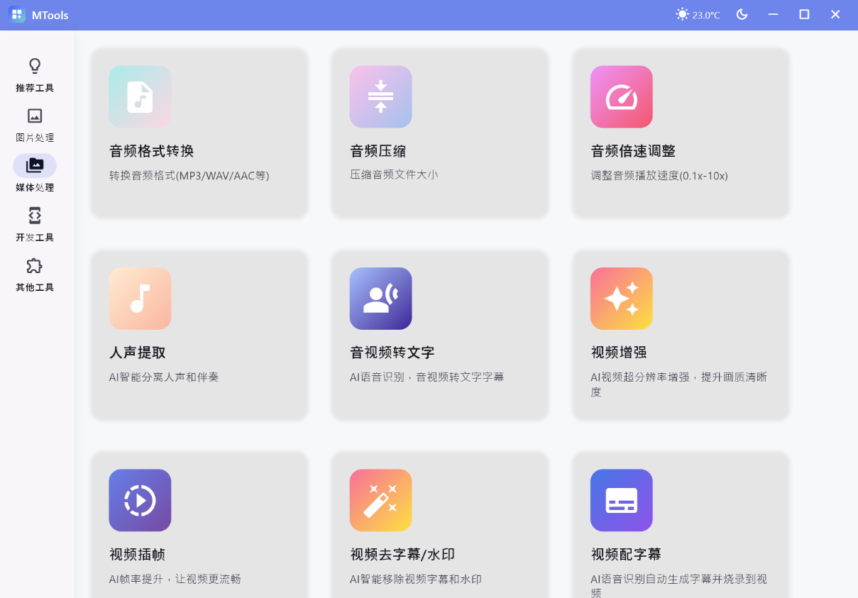 以及支持MP3、WAV、FLAC、MP4、AVI、MKV等主流格式的相互转换,帮助你能够轻松处理各类音视频文件!MTools 是一个集成图片、音视频处理的综合桌面工具箱,并且拥有AI 智能工具,例如AI背景移除、音视频人声分离、图像视频超分,视频补帧等工具,支持CUDA加速,支持AMD、Intel、NVIDIA显卡加速。截图的、转格式的、压视频的、去背景的……普通版本:支持NVIDIA、AMD、I