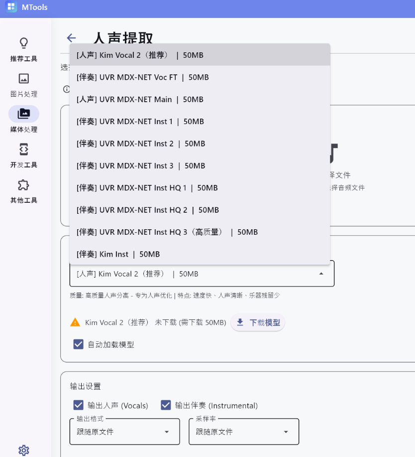 AI 音视频人声分离:专业级人声/伴奏分离,支持 UVR MDX-Net 模型,轻松制作卡拉OK伴奏。