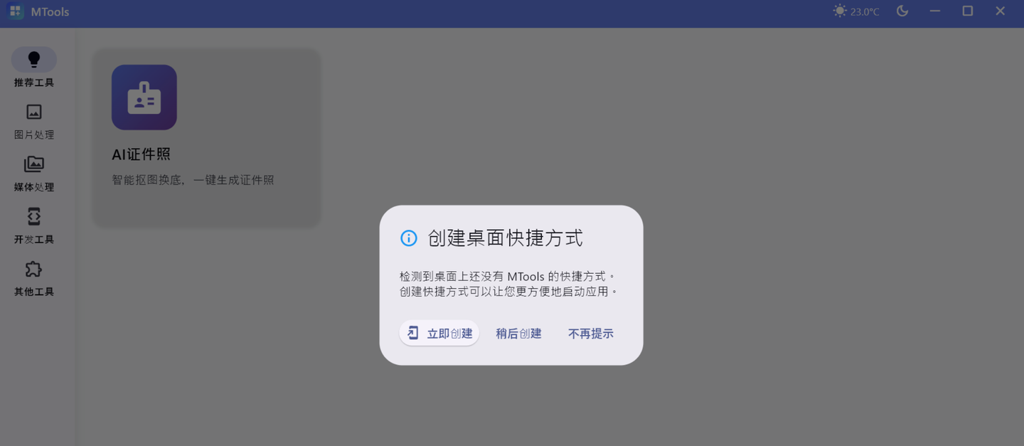 MTools 完全绿色便捷免安装,无需注册即可使用。首次启动时,还会贴心提示是否需要创建桌面快捷方式。