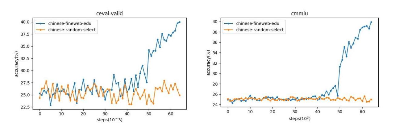 在训练初期,两组数据表现相近。但进入训练后期(第2个epoch,学习率快速下降阶段),使用Chinese Fineweb Edu训练的模型准确率显著上升,而使用随机数据训练的模型停滞在较低水平。