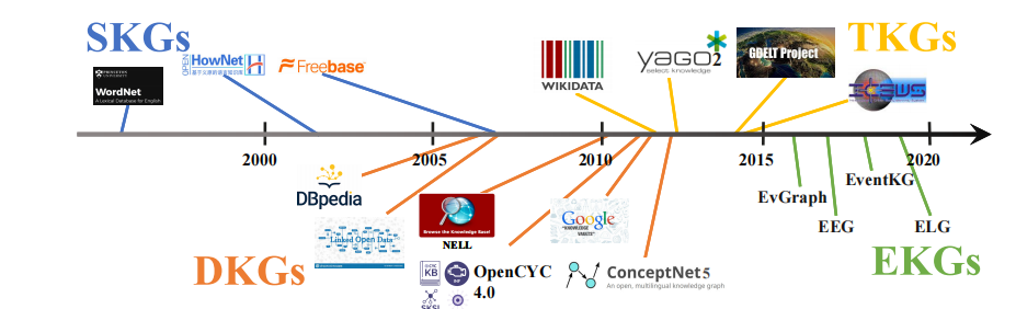 尽管三元组形式便于表示静态知识,但现实世界中的大多数知识元素始终处于演进或变化之中。因此,三元组从不更新或更新非常缓慢的静态知识图谱(Static Knowledge Graphs, SKGs),由于其知识的时效性而存在局限性。为解决这一问题,许多动态知识图谱(Dynamic Knowledge Graphs, DKGs)持续收集和更新知识以确保时效性。此外,时序知识图谱(Temporal Knowledge Graphs, TKGs)如ICEWS、GDELT、YAGO3和Wikidata等在三元组事实中附加时间信息,近年来引起越来越多的关注。除实体为中心的知识外,事件也是世界中的一种重要知识类型,这促进了以事件为中心的知识表示形式的涌现,如事件知识图谱(Event Knowledge Graph, EKG)。值得注意的是,事件本身具有动态性和时序性。
