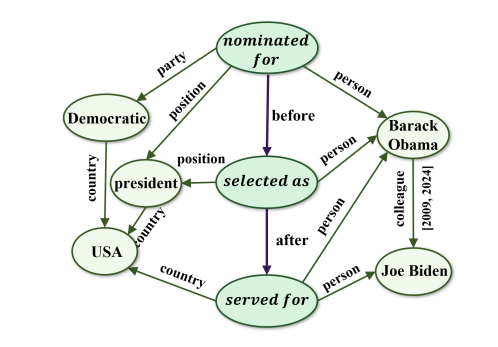 时序知识图谱在三元组中附加时间信息,形成四元组(主语实体, 关系, 宾语实体, 时间戳)的表示形式。这使得知识图谱能够明确表达事实的有效时间范围或发生时刻。主要的时序知识图谱包括: