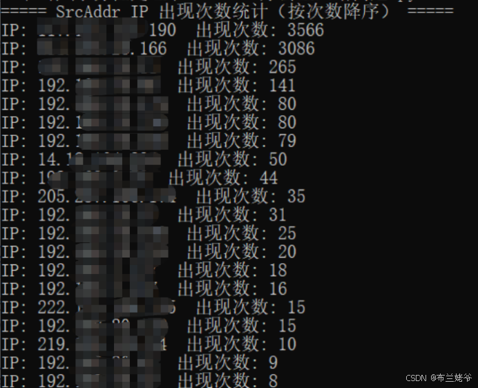 拿到全量session数据后,怎么解析也难不倒我(豆包)。让豆包再写一个脚本从txt文件里逐行读取数据,并且自动将srcIP的重复次数输出。