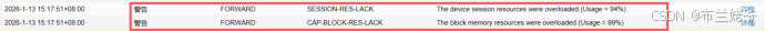 由于我不是搞这块的,但还是略懂一点点,翻找各种记录后,还是登录上了路由器,查看日志,网络中断期间有非常明确的异常记录“The device session resources were overloaded(Usage=94%)”、“The block memory resources were overloaded(Usage=90%)”,问了豆包,意思是会话数太多把会话容量和缓存都用满了。