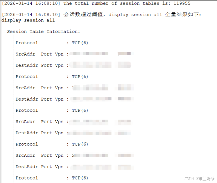命令行翻页不太行,那我写个脚本来翻行了吧,说干就干。让豆包写了个简单的telnet登录脚本(回想当年花了一周才调通telent啊,现在只需要几秒钟)。先定时执行“display session number”查总会话数,当总会话数明显异常时,比如大于1万的时候,执行“display session all”,且自动发送空格符翻页,把收到的信息全部记录到txt文件里。