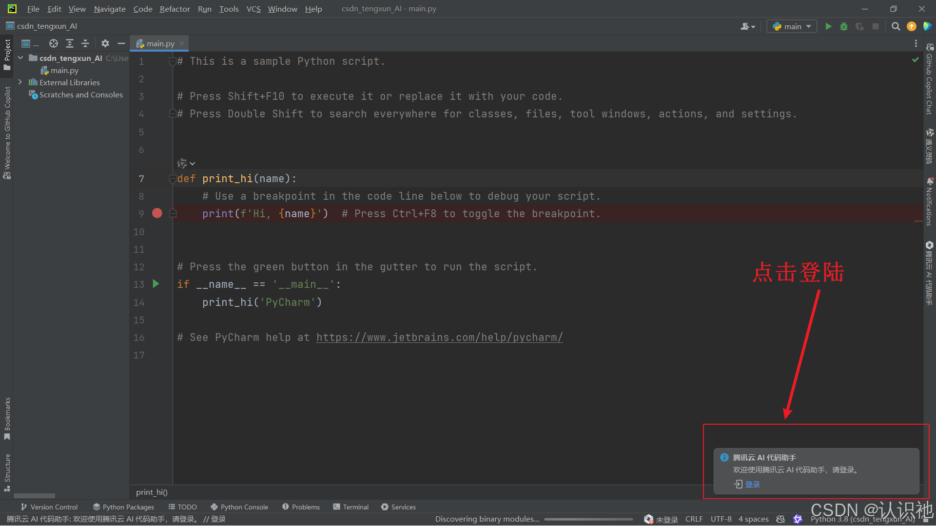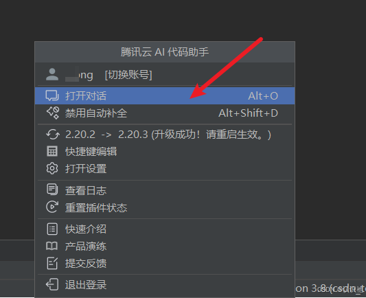 登陆成功后,点击腾讯AI代码助手图标,弹出的选项中,点击:打开对话。