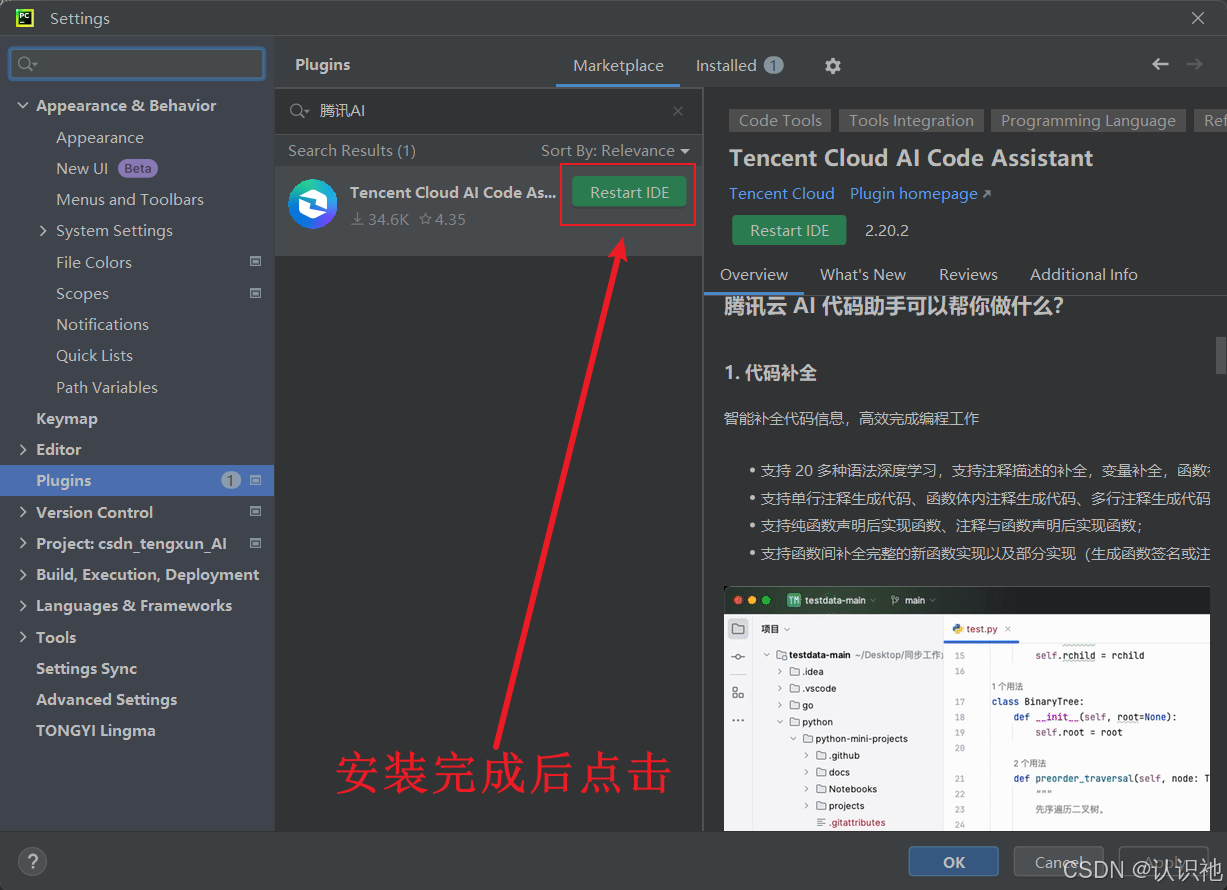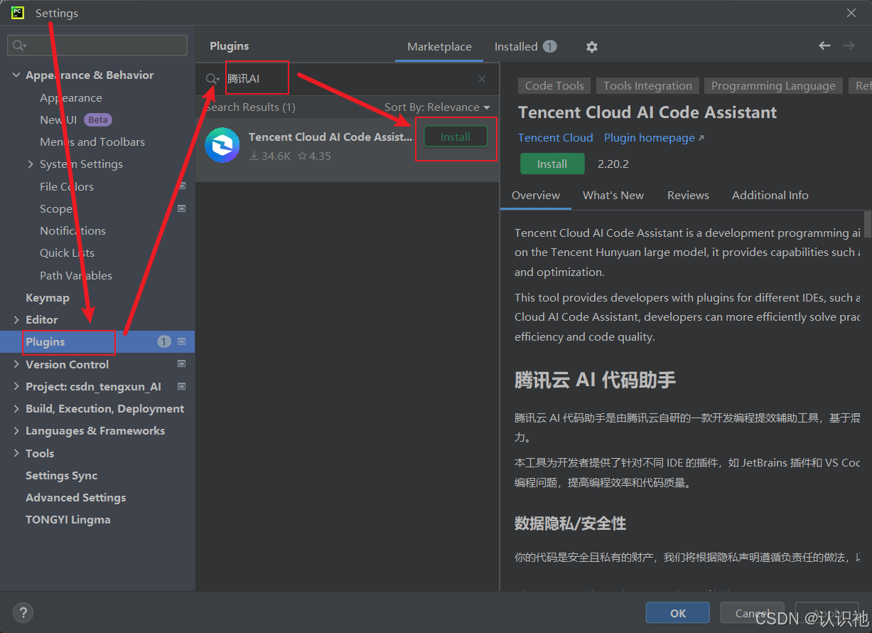 打开Pycharm,点击File(文件),然后选择Settings,选择Plugins,输入“腾讯AI”,并点击Install进行安装: