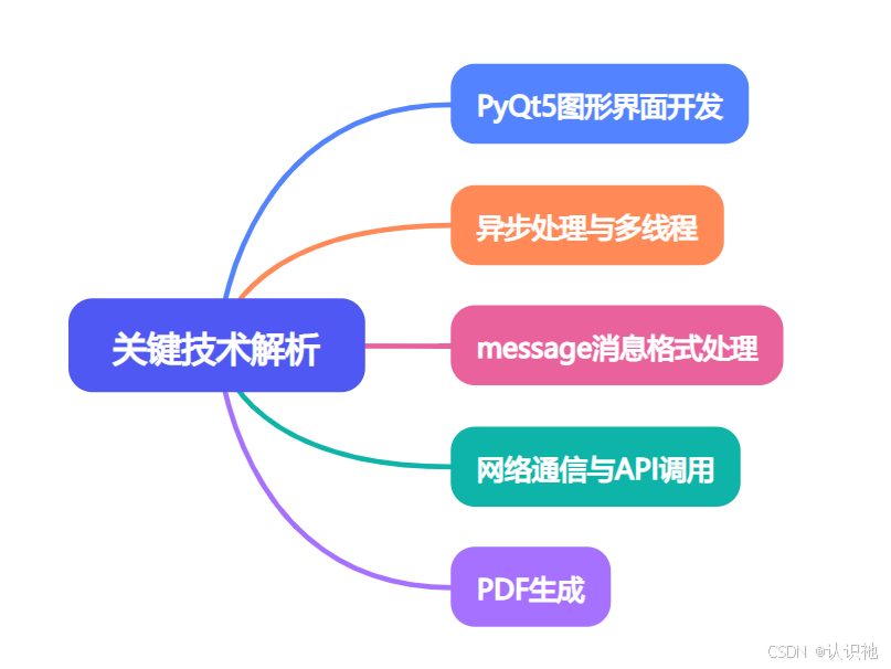 功能模块:界面构建、AI接口调用、消息格式转换、HTML解析和PDF生成等功能。