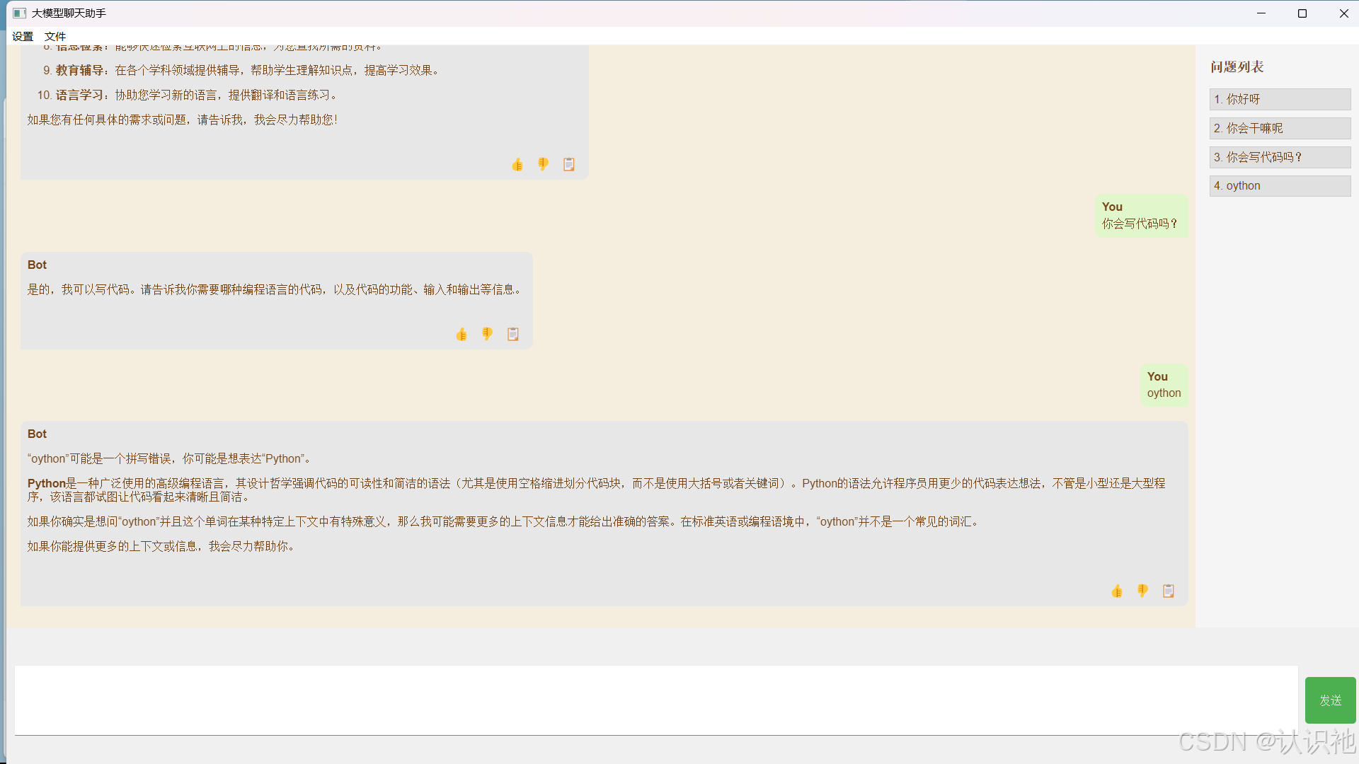 简单说,就是一个基于大模型的聊天助手应用,用户可以通过图形界面与AI进行交互。我开发的这个应用的主要功能包括: