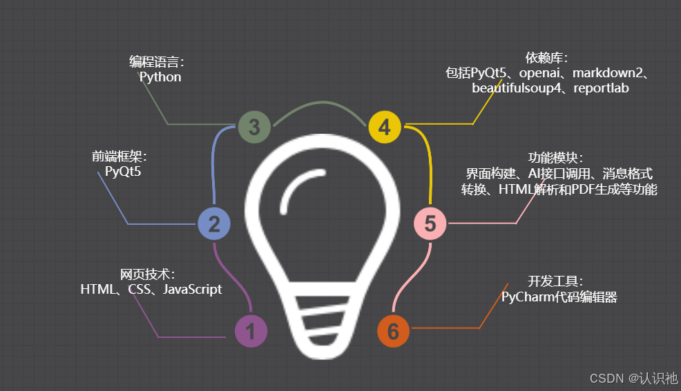 依赖库:包括PyQt5、openai、markdown2、beautifulsoup4、reportlab等。