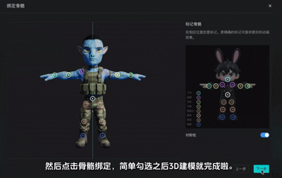 3. 自动骨骼绑定 平台识别角色形态适配骨骼和权重,确保人物可动作而无需手动设置。 避免了学习Rigging系统的复杂成本。