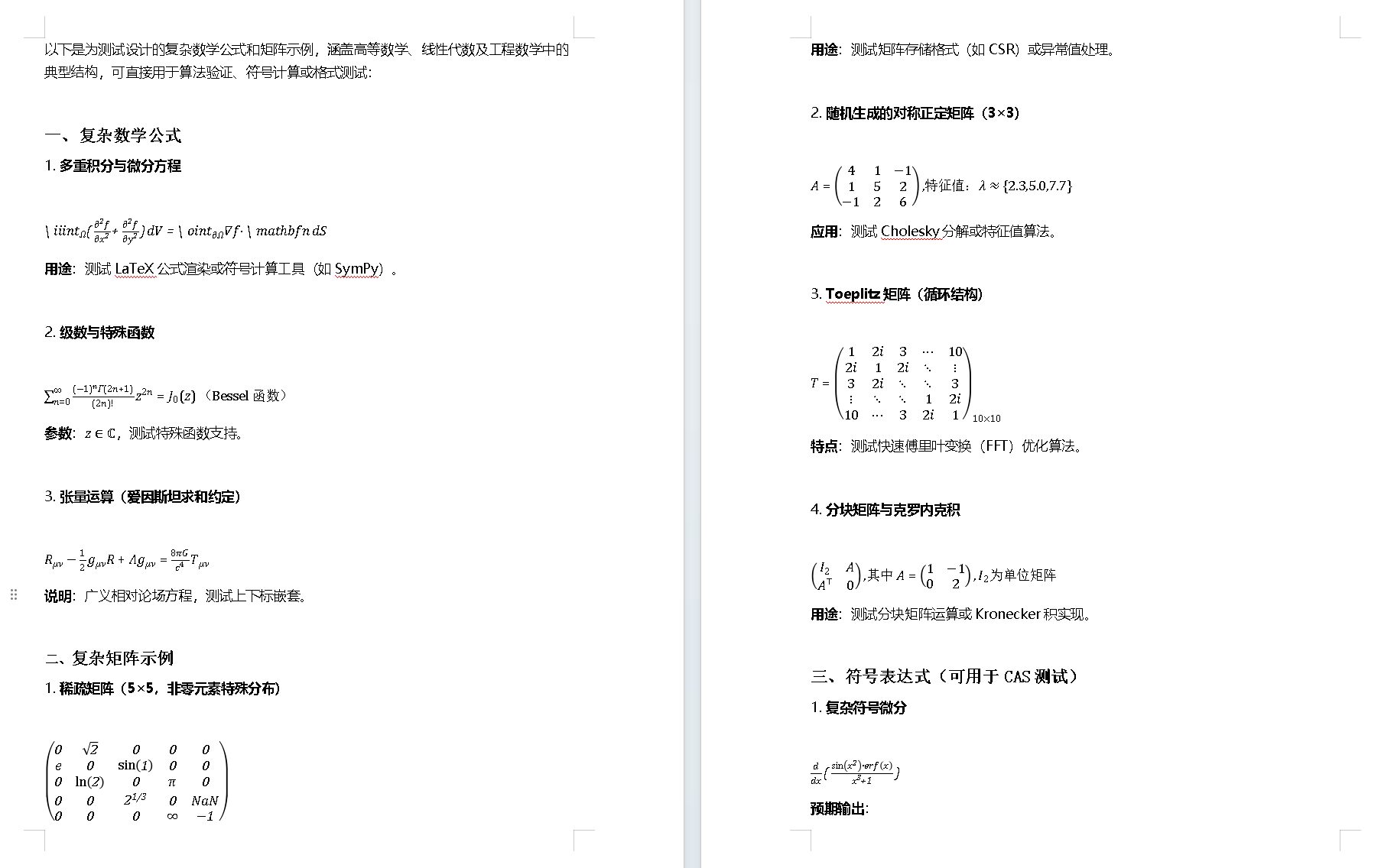 - 公式转换:通过自研的LaTeX转OMML(Office MathML)引擎,将公式代码直接转换为Word原生支持的可编辑公式对象,而非静态图片——双击即可修改积分上下限、矩阵元素等参数,复杂嵌套公式还原度达99%;