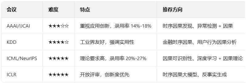 - 顶会更青睐 “理论 + 实验” 结合的论文,纯理论除非有重大突破(如因果可识别性证明),否则难中高分