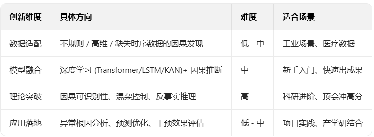 时间序列因果推断的创新可从四个维度切入,无需从零构建复杂理论: