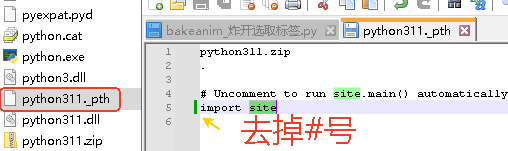 解压到智能体的Python311-embed目录中,找到python311._pth,去掉#号 import site