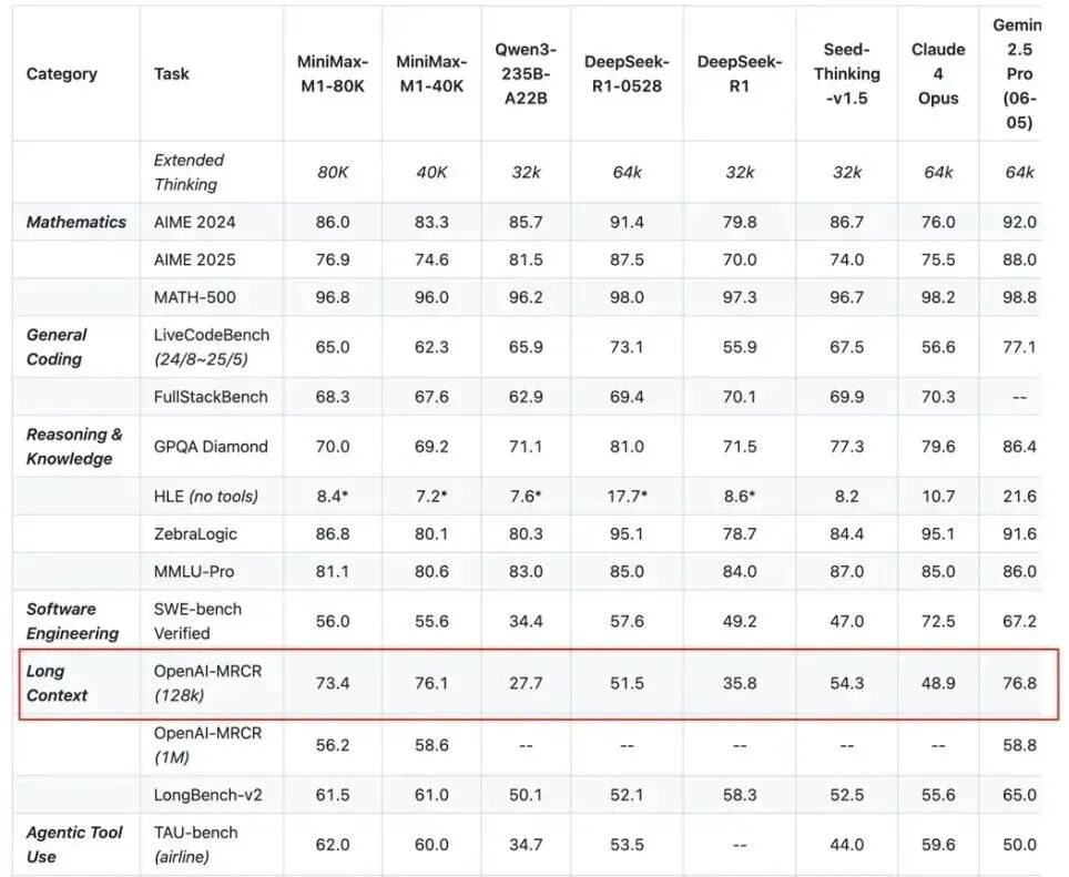 最近6月刚发布且开源的Minimax的m1模型也采用了混合MoE架构,拥有32个专家。模型总参数量为456B,每个token激活45.9B参数。这再次印证了约10:1的总参数与激活参数之比已成为大型MoE模型的行业基准,主要也带来了超长上下文方面的提升,整体性能可查看表格,表现颇为出色。