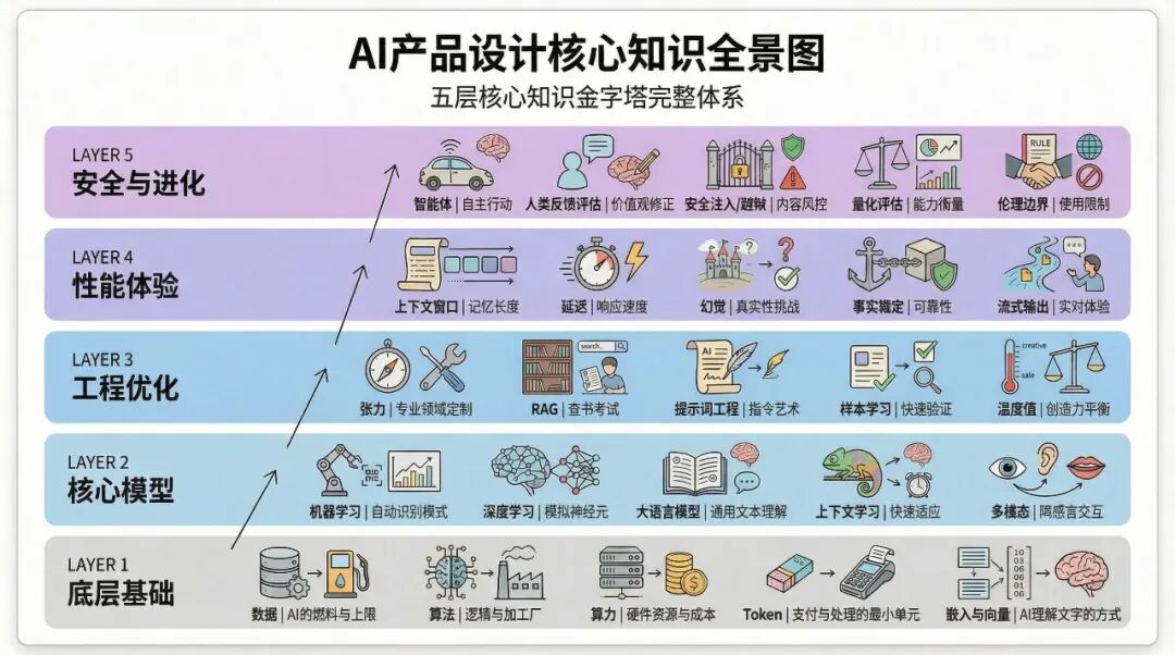 所以我把这一年的思考和实践整理成了这篇文章,用五层金字塔模型把AI的底层原理、核心技术、工程实现、性能边界、安全风险全部梳理清楚。