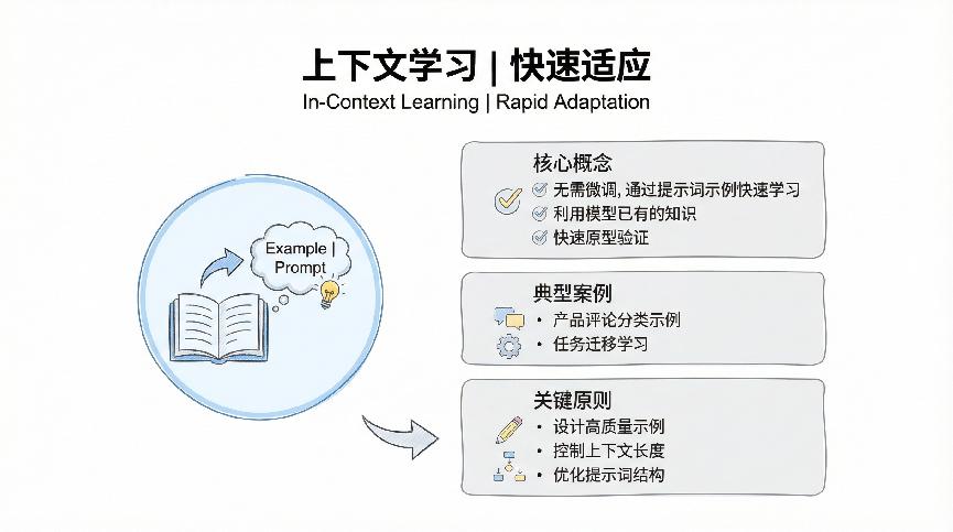 上下文学习为什么这么重要?因为它让AI产品的迭代速度大幅提升。以前开发一个新功能,要收集数据、训练模型、测试优化,可能要几周甚至几个月。现在很多场景下,你花几个小时设计好提示词和例子,功能就能跑起来了。虽然效果可能不如专门训练的模型,但80%的场景已经够用,而且可以快速验证想法是否可行。