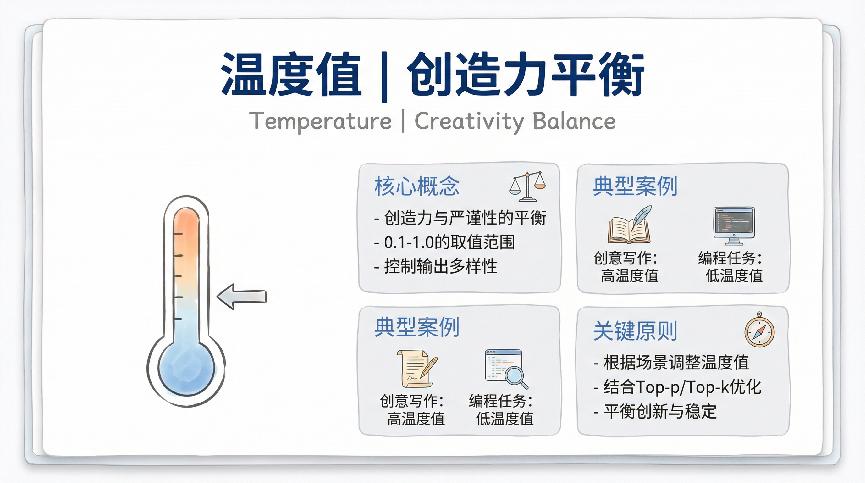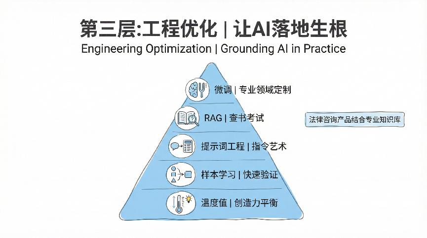 有了核心模型这个发动机,接下来就要考虑怎么让它真正跑起来,这就涉及到工程优化层。这一层包括张力、RAG、提示词工程、样本学习和温度值调节,都是把AI从实验室搬到产品中的关键技术。