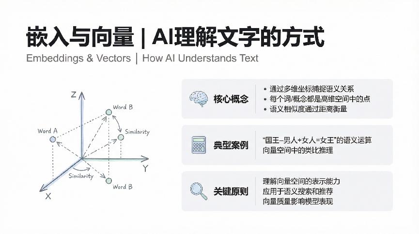 说完Token,我们再深入一步:这些Token是怎么变成AI能理解的东西的呢?答案是通过”嵌入”(Embeddings),把文字转换成向量。