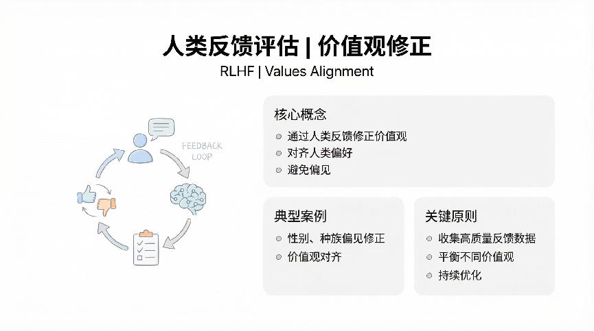 人类反馈不仅用来修正错误,更重要的是注入价值观。AI应该友好而不是冷漠,应该诚实而不是夸大,应该有所为有所不为。这些人类的价值判断需要通过反馈机制传递给AI。