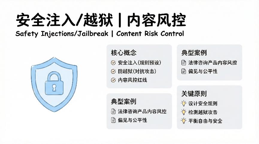任何AI产品都必须有安全红线。这包括不能生成违法内容、不能侵犯隐私、不能传播虚假信息、不能帮助用户做危险的事情。安全注入和防越狱就是保证AI不越过这些红线的技术手段。