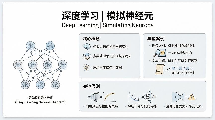 深度学习是机器学习的一个分支,它的灵感来源于人脑的神经网络。简单说就是把很多层的”神经元”堆叠起来,形成一个深层网络,让它能够学习更复杂的模式。