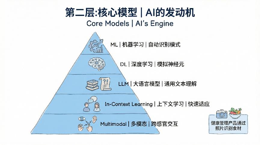 理解了底层的基础设施之后,我们往上走一层,来看看AI的”发动机”——核心模型层。这一层包括机器学习、深度学习、大语言模型和多模态,它们代表了AI能力的不同形态和演进路径。