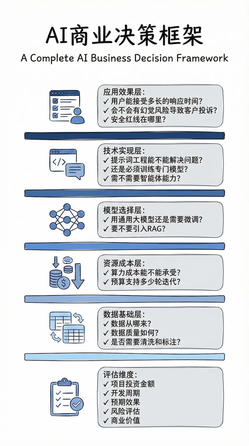 这个五层金字塔模型,覆盖了从底层基础到安全进化的30多个核心概念,本质上是一套完整的AI商业决策框架。当你要评估一个AI项目时,从底层往上问自己:数据从哪来、质量如何?算力成本能不能承受?用通用大模型还是需要微调?预算支持多少轮迭代?要不要引入RAG?提示词工程能不能解决问题还是必须训练专门模型?用户能接受多长的响应时间?会不会有幻觉风险导致客户投诉?需不需要智能体能力?安全红线在哪里?每一层想清楚了,你就知道这个项目该投多少钱、