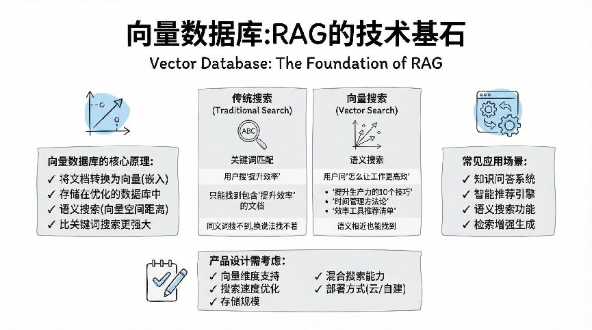 对产品经理来说,理解嵌入的意义在于:这是AI实现语义搜索、推荐、分类的基础。比如你做一个智能搜索产品,用户输入”如何提升工作效率”,传统关键词搜索只能匹配包含这些字的文档。但如果用向量搜索,它能找到”时间管理技巧”、”生产力工具推荐”这些语义相关但用词完全不同的内容,这就是嵌入技术的威力。