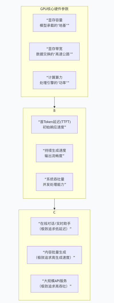 GPU在推理场景中的表现,并非由单一参数决定,而是如同一个“木桶”,其效能取决于多项参数协同作用下的最短木板。下图清晰地展示了从GPU硬件参数,到核心性能指标,再到典型应用场景的完整决策链条: