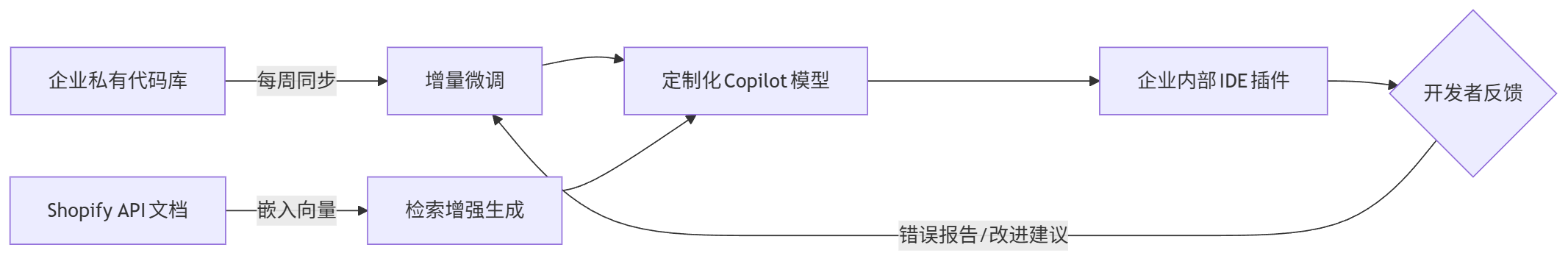 graph LR A[企业私有代码库] -->|每周同步| B[增量微调] C[Shopify API文档] -->|嵌入向量| D[检索增强生成] B --> E[定制化Copilot模型] D --> E E --> F[企业内部IDE插件] F --> G{开发者反馈} G -->|错误报告/改进建议| B