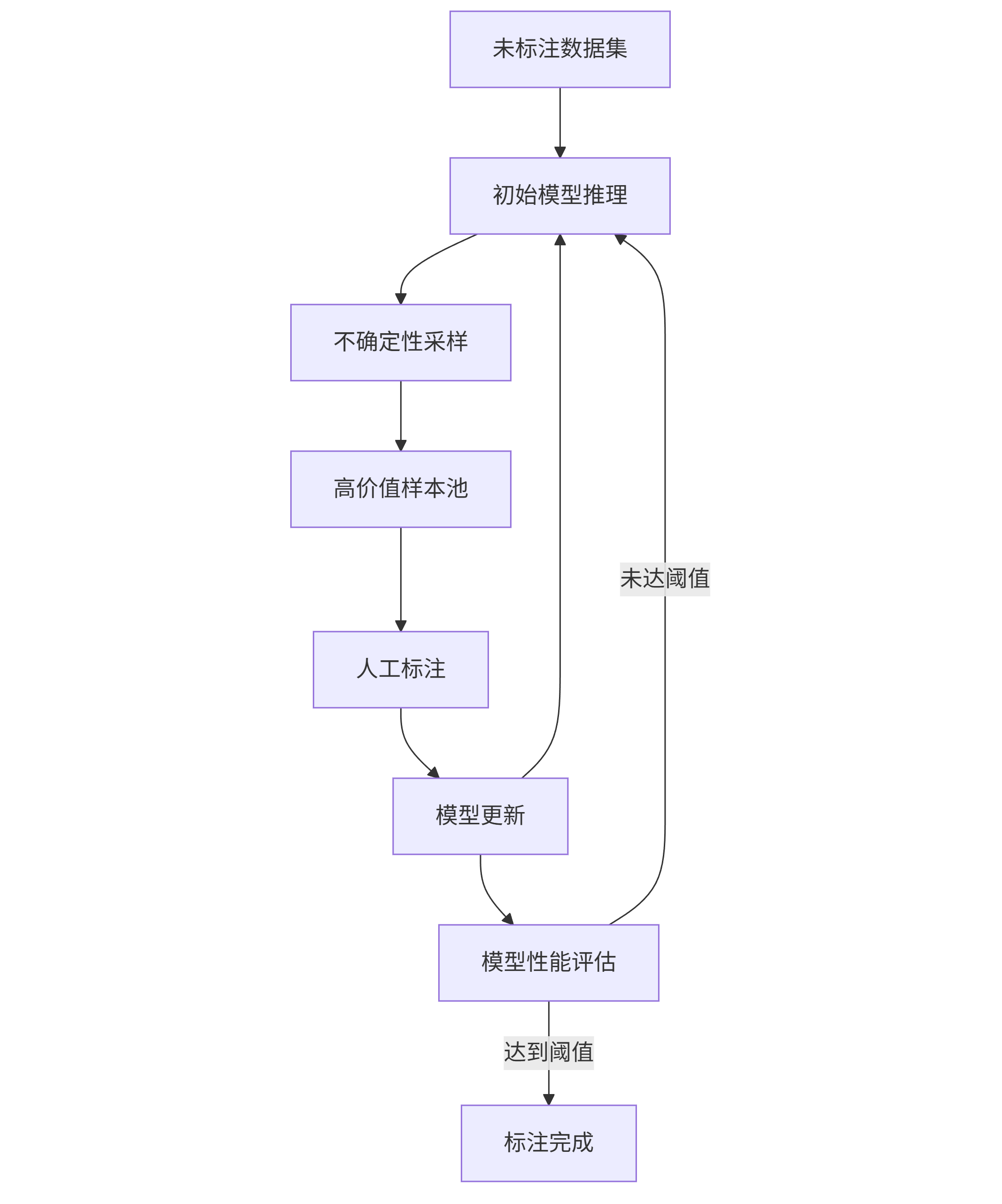 graph TD A[未标注数据集] --> B[初始模型推理] B --> C[不确定性采样] C --> D[高价值样本池] D --> E[人工标注] E --> F[模型更新] F --> G[模型性能评估] G -->|达到阈值| H[标注完成] G -->|未达阈值| B F --> B