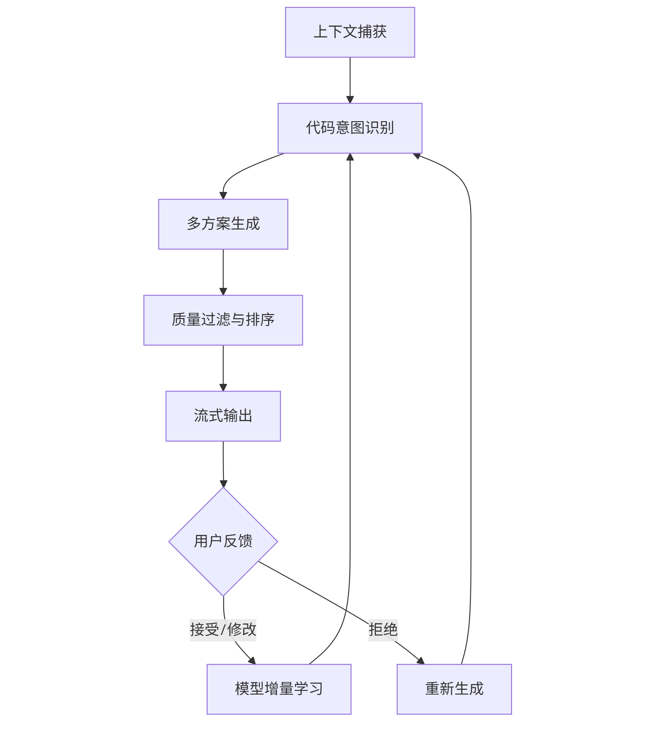 graph TD A[上下文捕获] --> B[代码意图识别] B --> C[多方案生成] C --> D[质量过滤与排序] D --> E[流式输出] E --> F{用户反馈} F -->|接受/修改| G[模型增量学习] F -->|拒绝| H[重新生成] G --> B H --> B