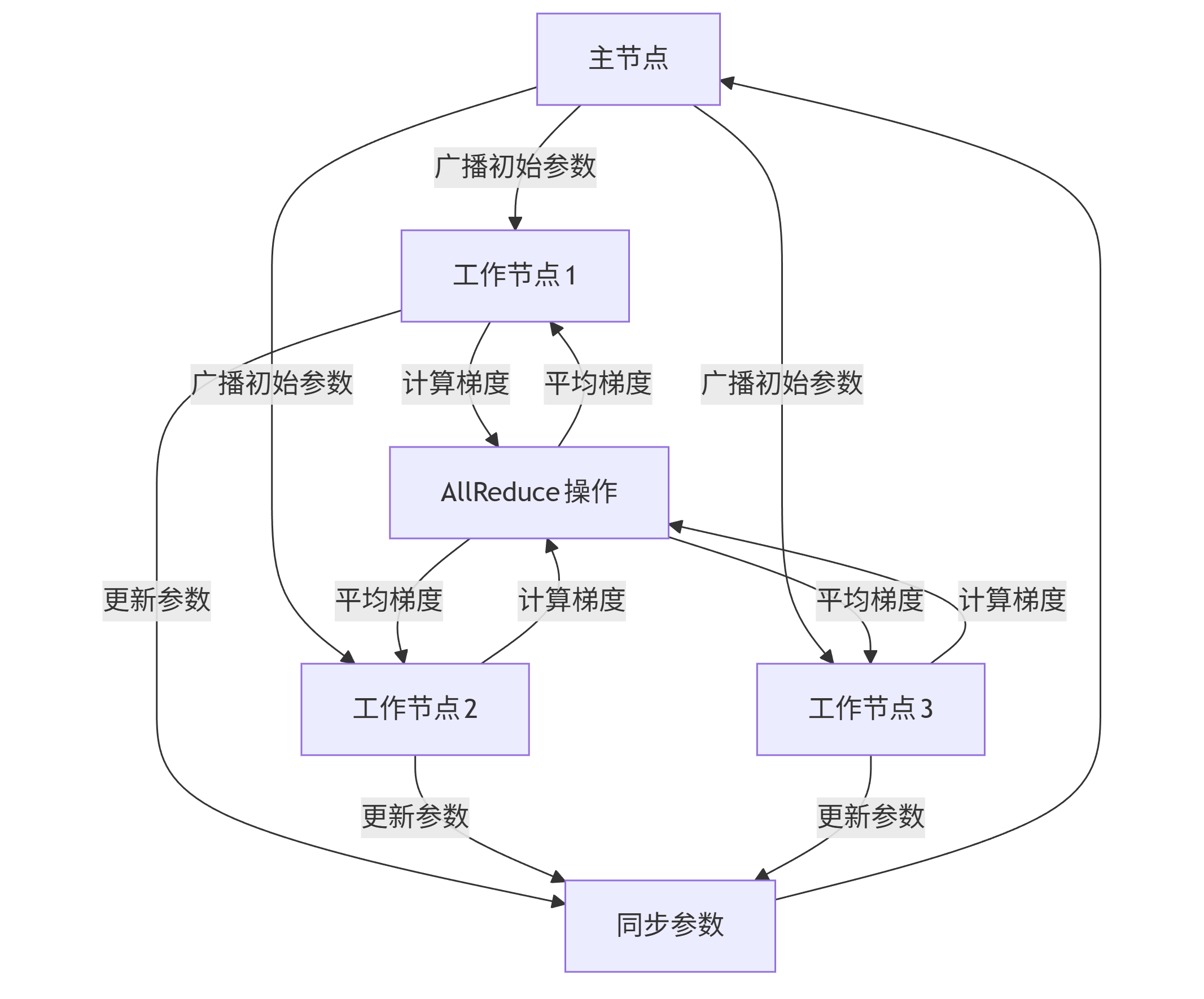graph TD A[主节点] -->|广播初始参数| B[工作节点1] A -->|广播初始参数| C[工作节点2] A -->|广播初始参数| D[工作节点3] B -->|计算梯度| E[AllReduce操作] C -->|计算梯度| E D -->|计算梯度| E E -->|平均梯度| B E -->|平均梯度| C E -->|平均梯度| D B -->|更新参数| F[同步参数] C -->|更新参数| F D -->|更新参数| F F --> A