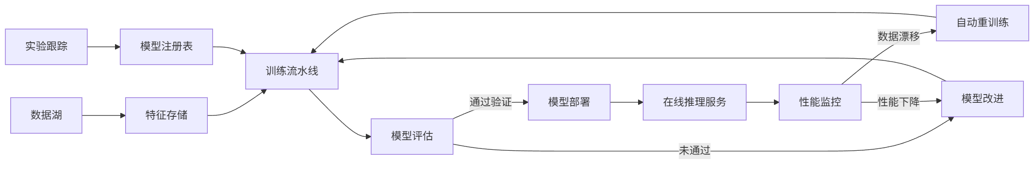 graph LR A[数据湖] --> B[特征存储] C[实验跟踪] --> D[模型注册表] B --> E[训练流水线] D --> E E --> F[模型评估] F -->|通过验证| G[模型部署] F -->|未通过| H[模型改进] G --> I[在线推理服务] I --> J[性能监控] J -->|数据漂移| K[自动重训练] K --> E J -->|性能下降| H H --> E