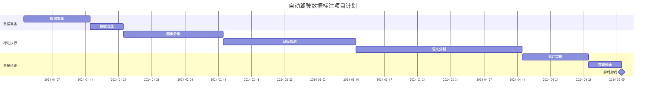 gantt dateFormat YYYY-MM-DD title 自动驾驶数据标注项目计划 section 数据准备 数据采集 :a1, 2024-01-01, 14d 数据清洗 :a2, after a1, 7d section 标注执行 图像分类 :b1, after a2, 21d 目标检测 :b2, after b1, 28d 语义分割 :b3, after b2, 35d section 质量检查 标注审核 :c1, after b3, 14d 错误修正 :c2, after c1, 7d 最终验收 :milestone, after c2, 0d