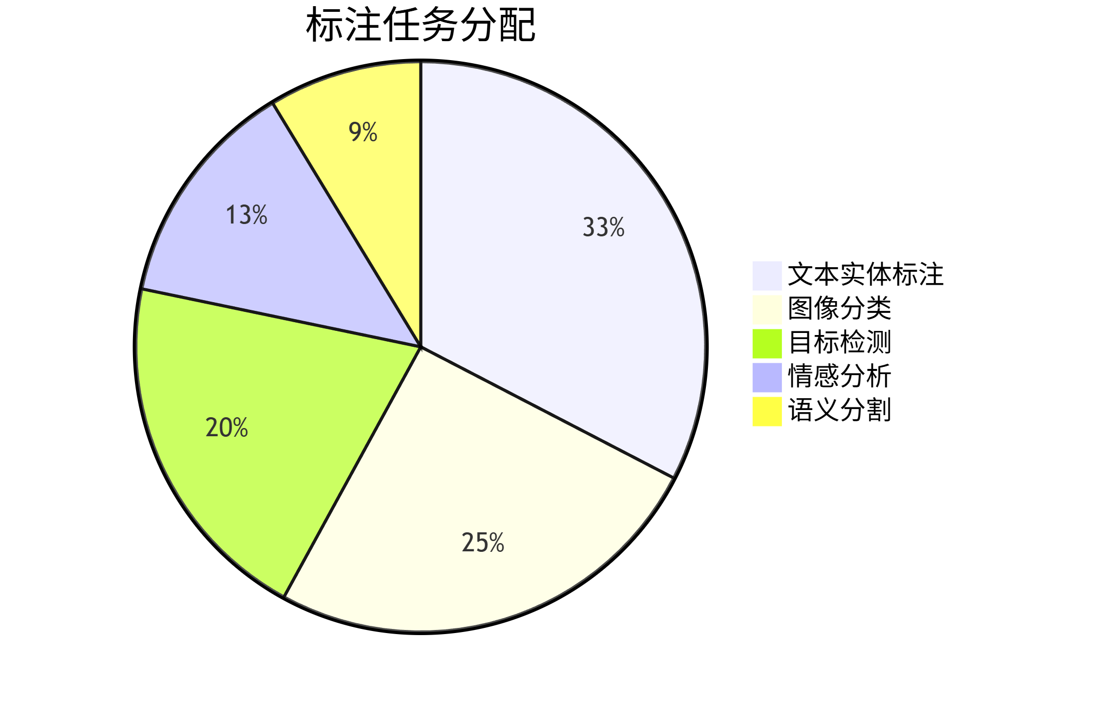 pie title 标注任务分配 "图像分类" : 3500 "目标检测" : 2800 "语义分割" : 1200 "文本实体标注" : 4500 "情感分析" : 1800