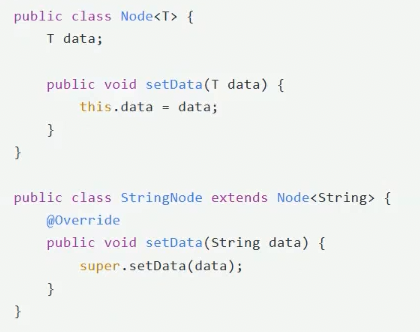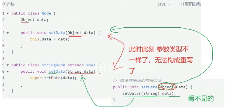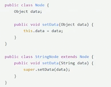 此比时stringnode的setdata方法并没有真正覆盖父类的setData方法(参数类型不同)。为了解决这个题,编译器会在stringnode中生成一个桥接方法: