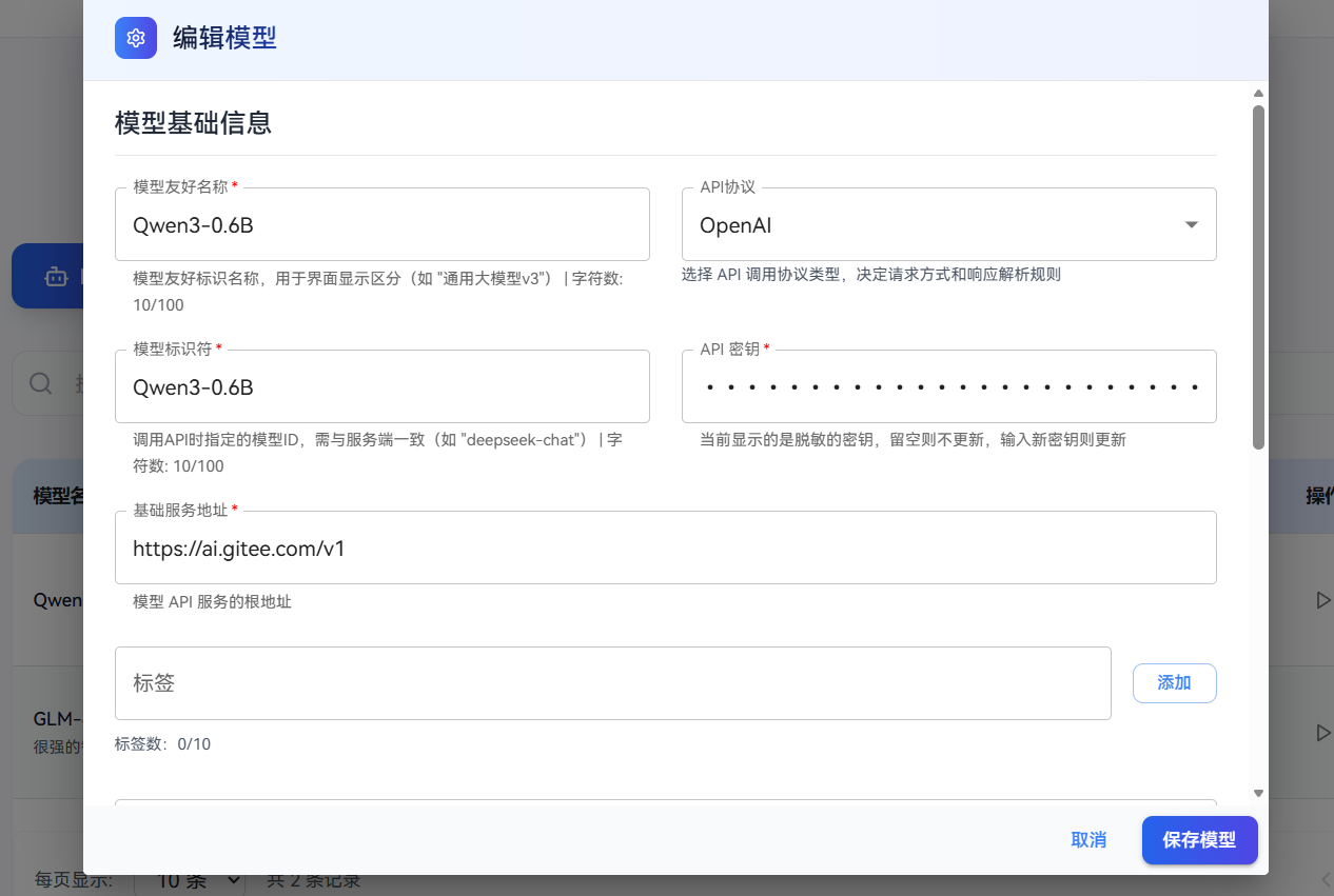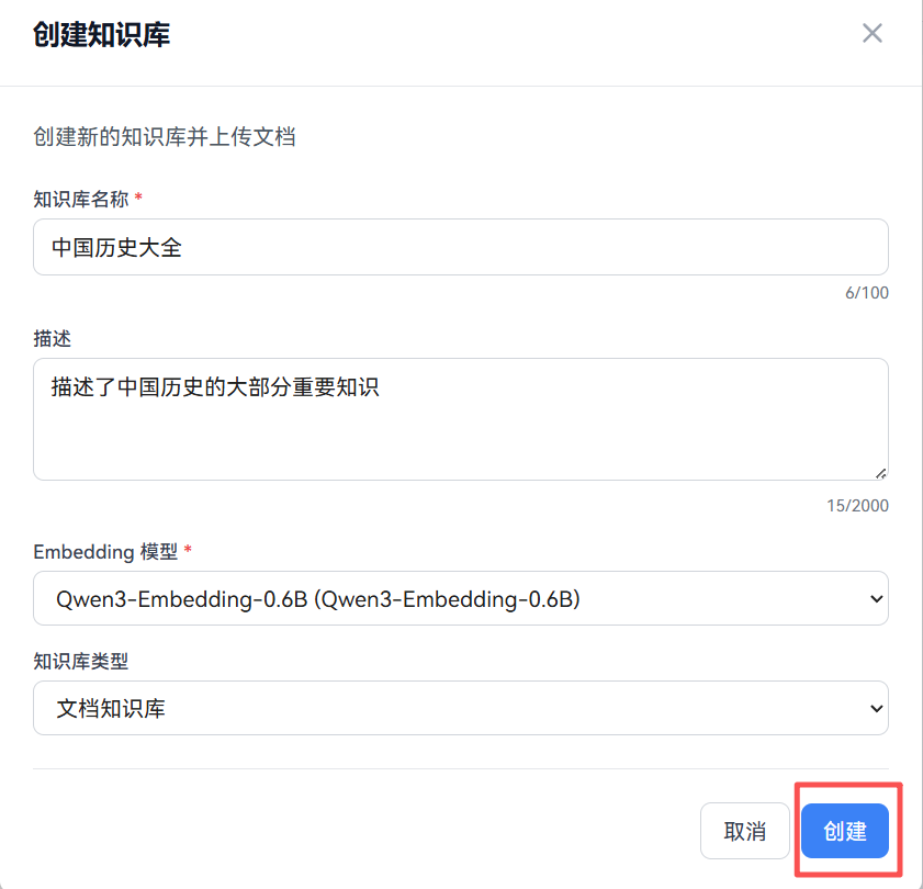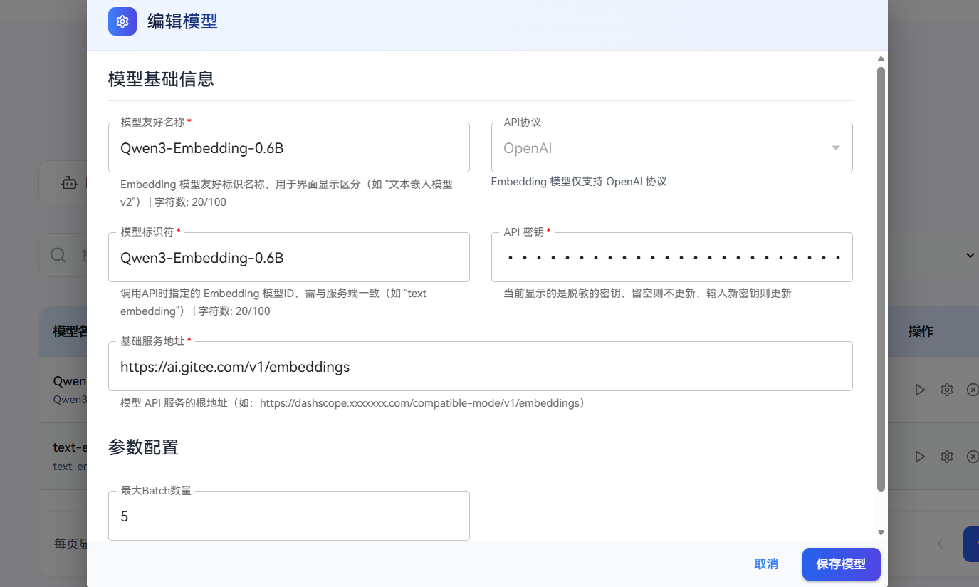 在新版本0.1.2中着重引入了知识库管理,而当我们创建知识库的时候我们就要用的这种模型,当然,我们这里使用的是Qwen3-Embedding-0.6B,因为这个模型是免费的,我们只要在上面填好配置,就能保存了。