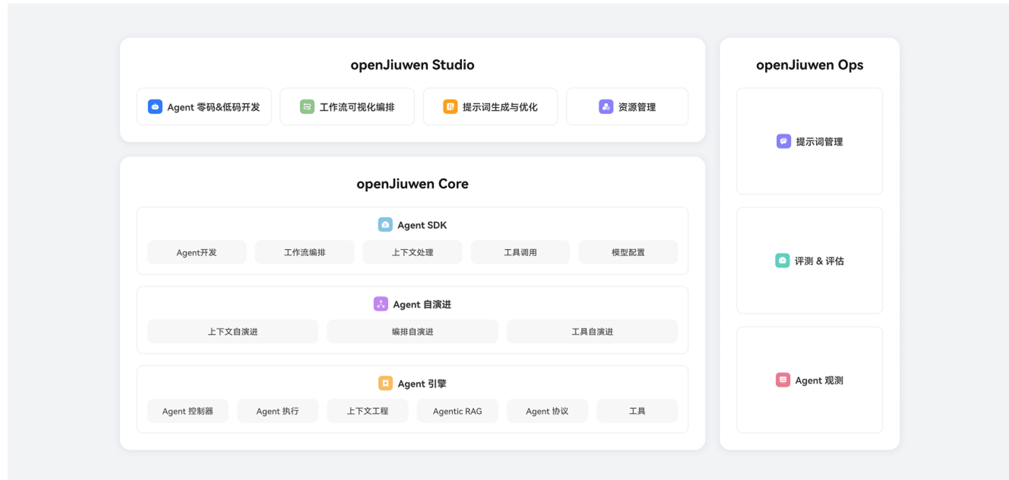 - openJiuwen 为原生支持多智能体协同和智能体自演进而设计,系统架构主要由openJiuwen Core、openJiuwen Studio 和 openJiuwen Ops(即将开放) 三大部分组成,为开发者提供从Agent开发、调优到部署的一站式平台。