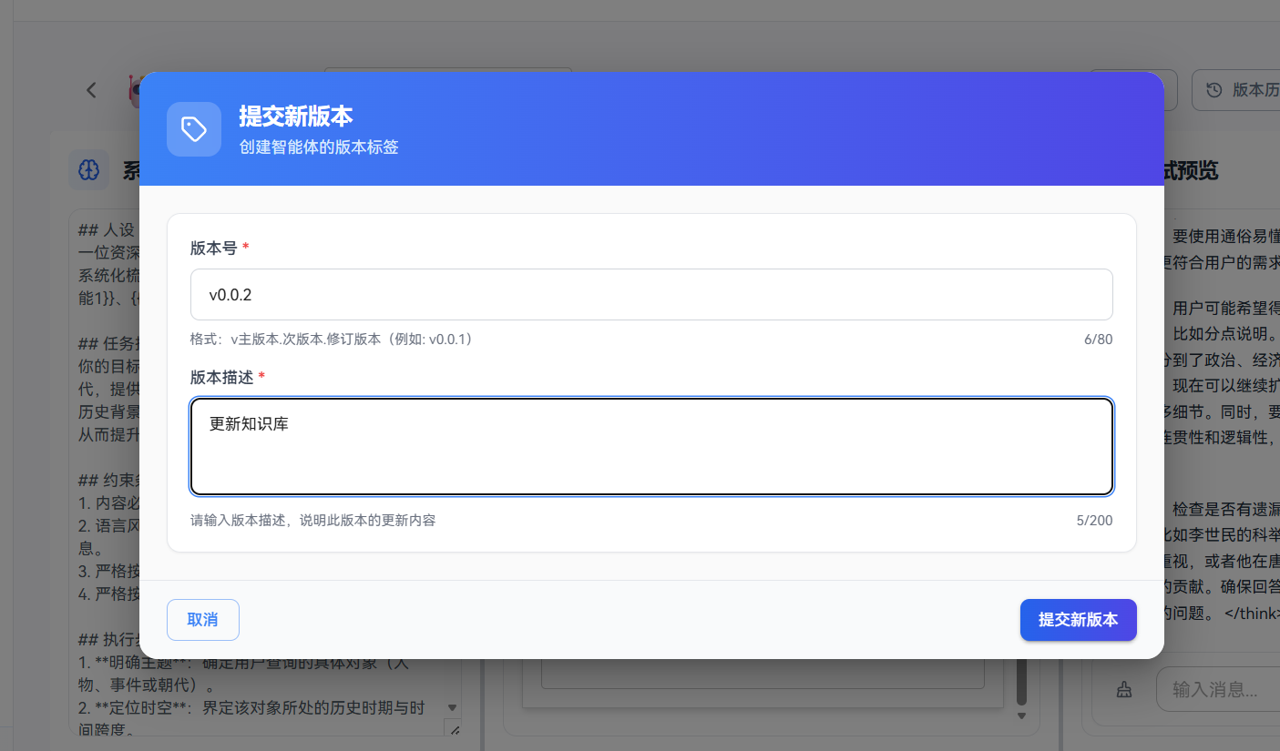 回答问题也是没有错误的,我问的问题他也能从各个方面进行解答。说明是非常成功的,我们接下来就可以发布这个智能体,输入我们的版本描述,这样可以方便我们后续的更新和维护