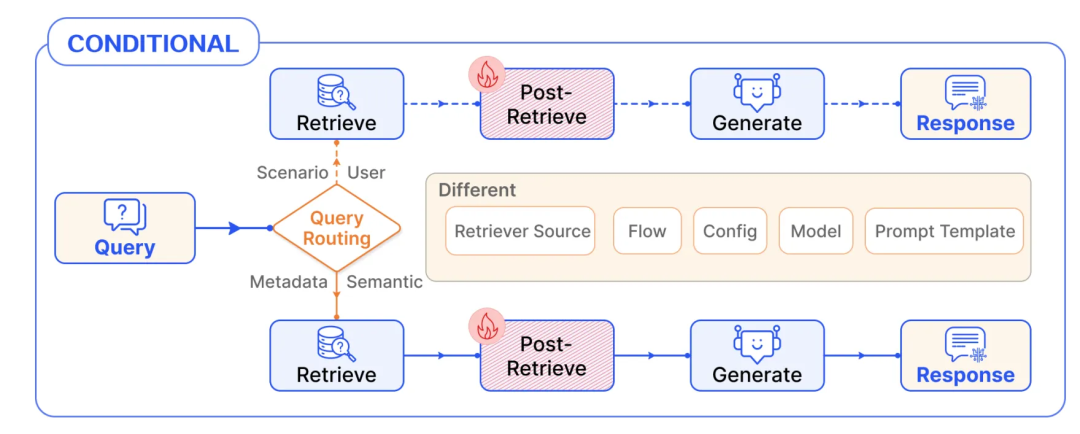 该框架核心是一个系统决策中心的Router Agent,该Agent动态处理信息检索,集成操作,类似上述Modular RAG中提到的条件编排的Agent代理版本,比较适用于多检索源的简单问答场景。
