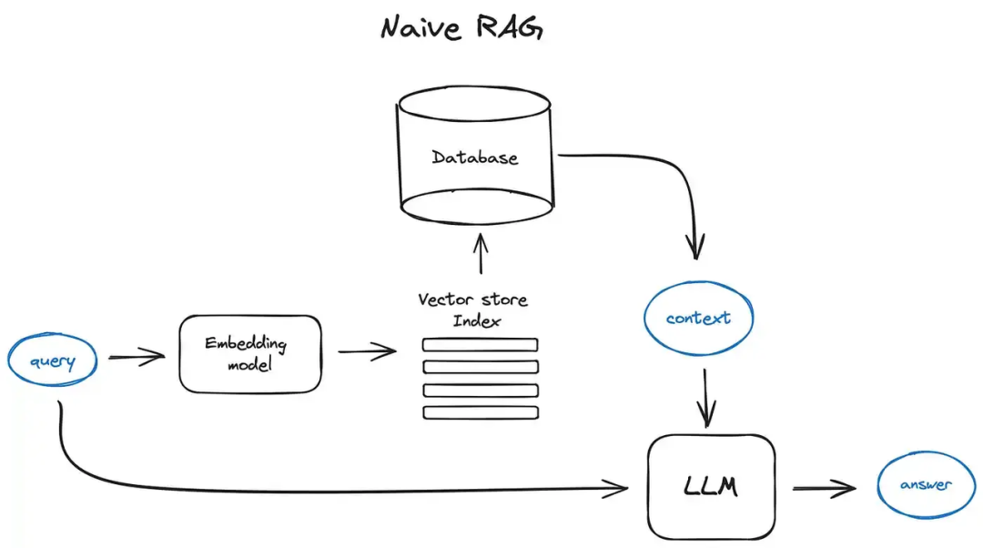 标准的 RAG 流程:将文本分块,然后使用一些 Transformer Encoder 模型将这些块嵌入到向量中,将所有向量放入索引中,最后创建一个 LLM 提示,告诉模型根据我们在搜索步骤中找到的上下文回答用户的查询。