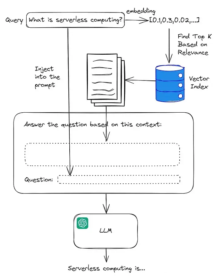在运行时,使用同一编码器模型对用户的查询进行向量化,然后搜索该查询向量的索引,找到 top-k 个结果,从我们的数据库中检索相应的文本块,并将它们作为上下文输入到 LLM 提示中。